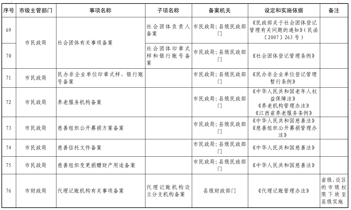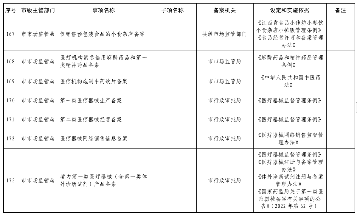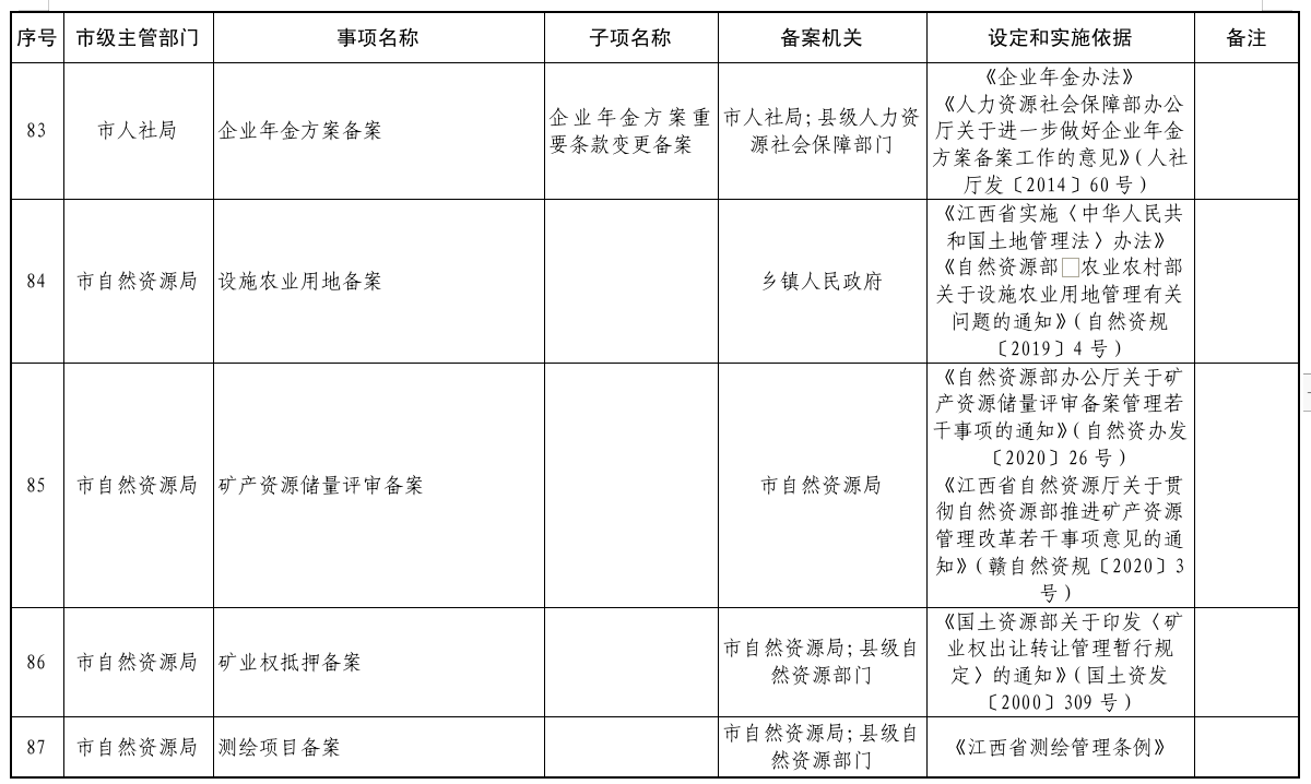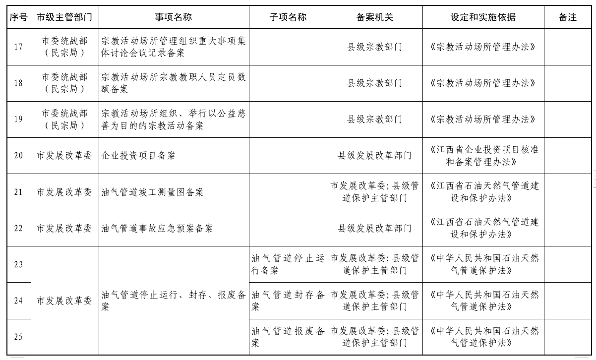 为贯彻落实《江西省人民政府办公厅关于印发江西省行政备案管理办法的通知》(赣府厅发〔2023〕20号)精神,进一步深化“放管服”改革优化营商环境,规范行政备案事项,消除市场准入隐性壁垒,提升政务服务标准化、规范化、便利化水平,经市政府研究,决定对《九江市行政备案事项清单(2023年版)》进行动态调整,现公布《九江市行政备案事项清单(2024年版)》。