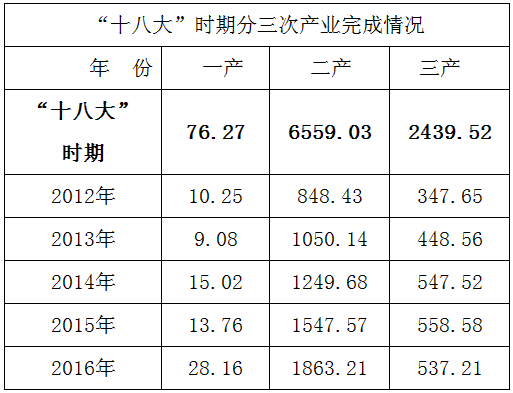“十八大”时期,全市固定资产投资结构进一步优化。在完成投资总量9075.12亿元中,第一产业投资累计完成76.27亿元,年均增长28.7%,占全部投资比重为0.8%;第二产业投资累计完成6559.03亿元,年均增长21.7%,占全部投资比重为72.3%;第三产业投资累计完成2439.52亿元,年均增长11.5%,占全部投资比重为26.9%。三大产业的投资比重由2012年的0.8:70.3:28.8调整为2016年的1.2:76.7:22.1。“一、二、三产”同步发展,工业投资贡献更加突出。