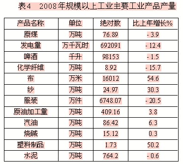 主要工业品产量有增有减。原煤76.89万吨,下降3.9%;化学纤维8.92万吨,下降15.7%;纱24.97万吨,增长30.3%;服装6748.07万件,下降20.5%。(见表4)