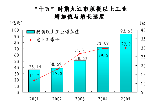 工业快速发展,实力不断增强。2005年,我市继续实施主攻工业战略,加快新型工业化进程,工业经济实力进一步增强。全市工业实现工业增加值151.18亿元,比上年增长17.8%。其中规模以上工业实现增加值93.63亿元,比上年增加21.54亿元,增长29.9%(见表3)。产品销售率98.2%;规模以上工业主营业务收入338.19亿元,增长26.2%;实现利税24.18亿元,增长31.2%。