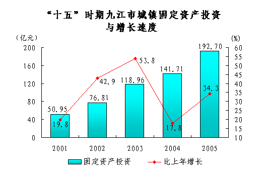 固定资产投资规模不断扩大,对经济发展的拉动作用明显增强。全年完成全社会固定资产投资213.5亿元,比上年增长37.7%。其中,城镇以上固定资产投资192.70亿元,比上年增长34.3%,增速比上年上升16.5个百分点(其中:新建120.6亿元,增长33.1%;扩建36.91亿元,增长35.1%;改建和技术改造22.49亿元,增长29.1%;房地产开发23.92亿元,增长24.6%)。投资结构继续改善,第二产业投资102.52亿元,增长54.6%;第三产业投资87.65亿元,增长14.4%。30个超亿元的重点项目完成投资76.05亿元。