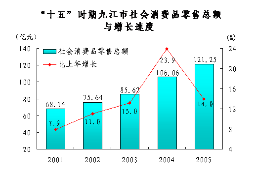 商业贸易繁荣。2005年,在居民收入增加、消费能力提升和旅游经济的带动下,城乡消费品市场规模进一步扩大,全年实现社会消费品零售总额达到121.25亿元,比上年增长14.0%。分行业看,餐饮业零售额13.88亿元,增长19.2%,批发零售业零售额106.71亿元,增长14.3%。分城乡看,城乡市场协调发展。城市消费品零售额55.82亿元,增长15.4%;县及县以下消费品零售额65.43亿元,增长23.5%。从居民消费支出来看,城市居民人均消费性支出5810元,增长8.6%;农村居民人均消费性支出2430元,增长24.3%。