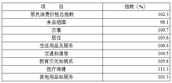 居民消费价格上涨2.3%。其中八大类商品“七涨一跌”,医疗保健类上涨11.3%,教育文化和娱乐类上涨5.8%,交通和通信类上涨4.5%,居住类上涨3.6%,其他用品和服务类上涨1.3%,衣着类上涨0.7%,生活用品及服务类上涨0.4%,食品烟酒类下降1.9%。商品零售价格指数上涨0.7%,工业生产者出厂价格指数上涨11.1%,工业生产者购进价格指数上涨16.6%。