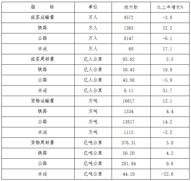 全年旅客运输量9572万人,比上年下降2.8%,其中,公路旅客运输量8147万人,下降6.1%;铁路旅客运输量1365万人,增长22.2%。货物运输量16617万吨,比上年增长12.1%,其中,公路货物运输量13817万吨,增长14.2%;铁路货物运输量1334万吨,增长4.4%。