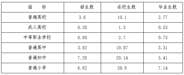 全市共有普通高校7所,当年招生3.6万人,在校生10.10万人。各类中等职业学校23所,在校生2.70万人。普通中学281所,在校生31万人,其中高中在校生10.87万人,初中在校生20.14万人。普通小学589所,在校生39.9万人。初中阶段适龄人口入学率为99.9%,小学学龄儿童入学率为100 %。成人高等专业学校招生0.28万人,在校生1.3万人。