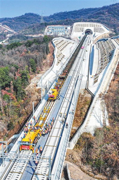 12月19日,在柴桑区的京港高铁昌九段(简称昌九高铁)尖山岭隧道铺轨施工现场,随着铺轨车将第一对500米长钢轨平稳铺设到位,昌九高铁正式进入全线铺轨阶段。据了解,昌九高铁全线共计需要完成295.28公里的钢轨铺设任务,预计2026年5月完成。(九江日报 记者 李涛渊 摄)