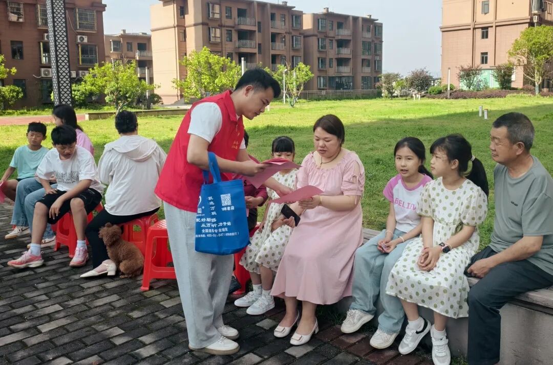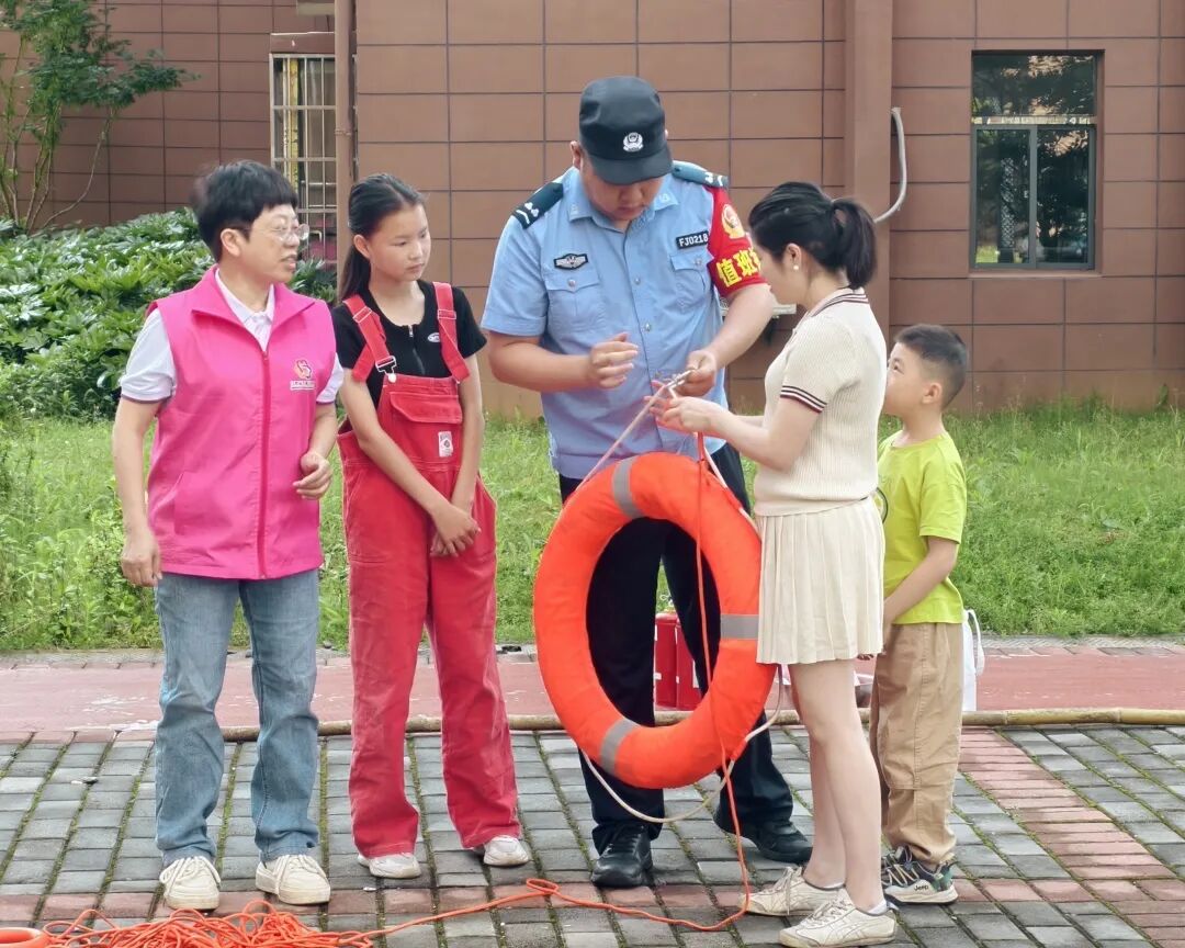 防溺水宣传现场:志愿者现场演示救生圈、长杆等器材的正确使用方法,并指导孩子们模拟落水救援场景,强调“呼叫大人、寻找浮具、不盲目下水”的自救原则。