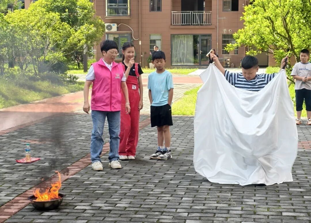 消防演练环节:志愿者手持灭火器分解“提、拔、握、压”操作步骤,同时展示灭火毯覆盖火源的技巧,家长与孩子在工作人员监护下轮流实操,掌握初期火灾扑救技能。