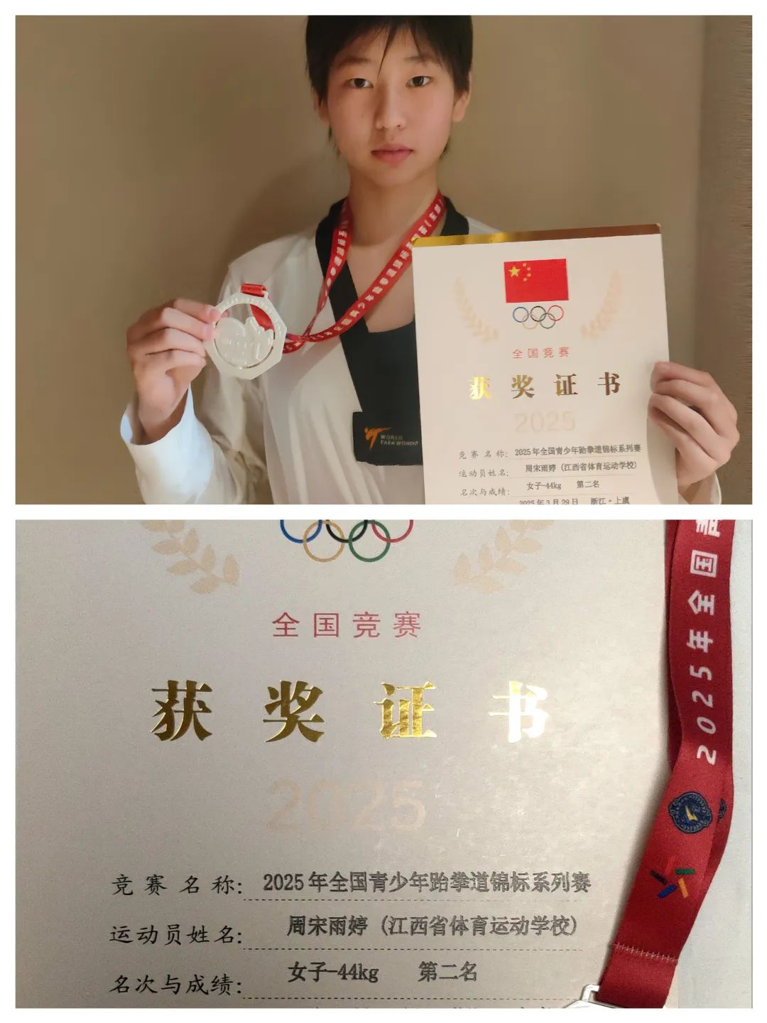On March 30th, the 2025 National Youth Taekwondo Championship Series (Eastern League) came to a successful conclusion in Shaoxing City, Zhejiang Province. Zhou Songyuting from Jiujiang City performed outstandingly. Passing through each of the rounds, she ultimately won the runner-up position and the silver medal.