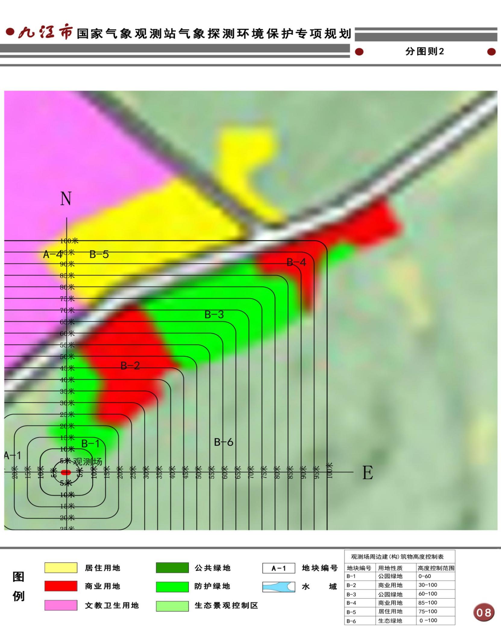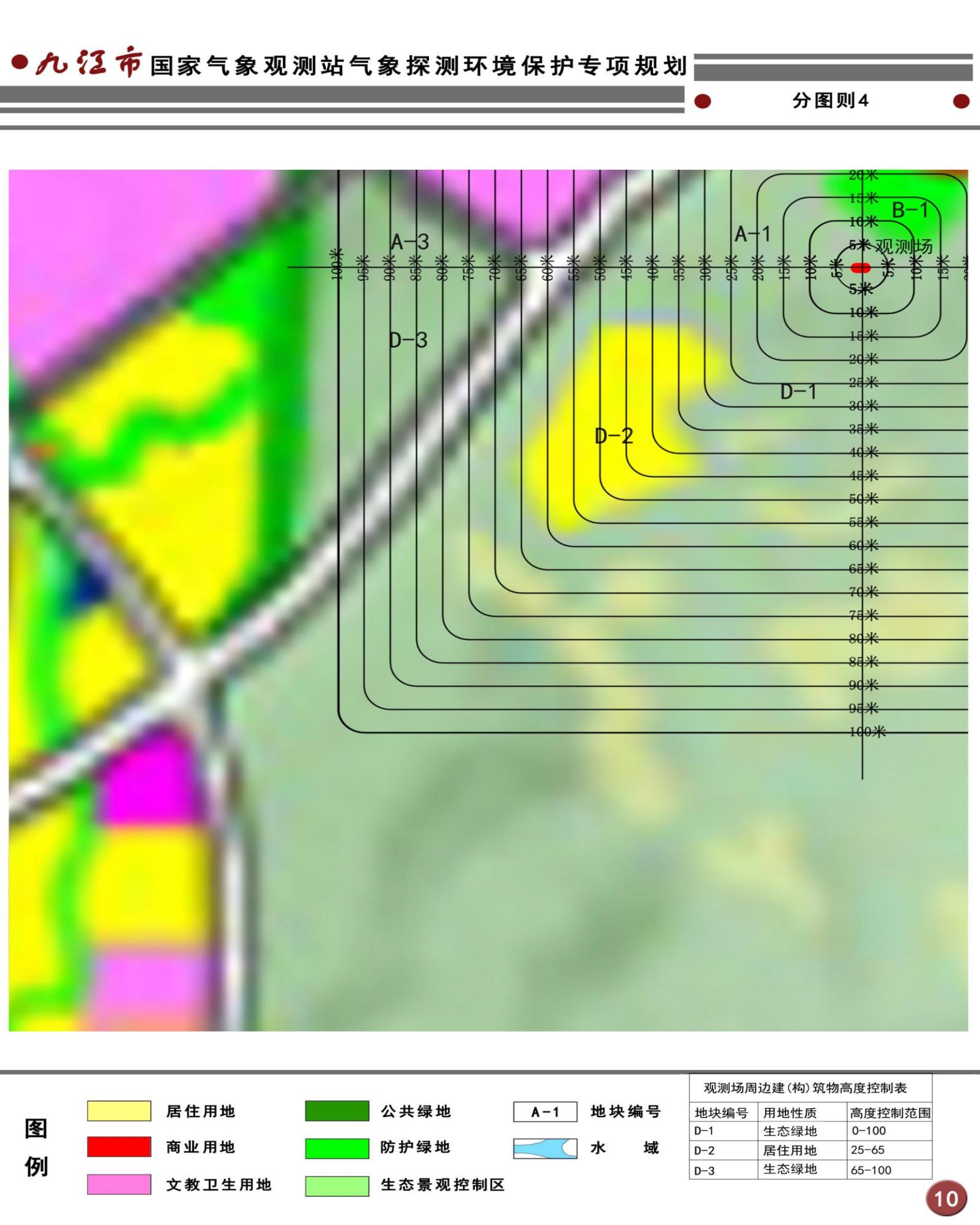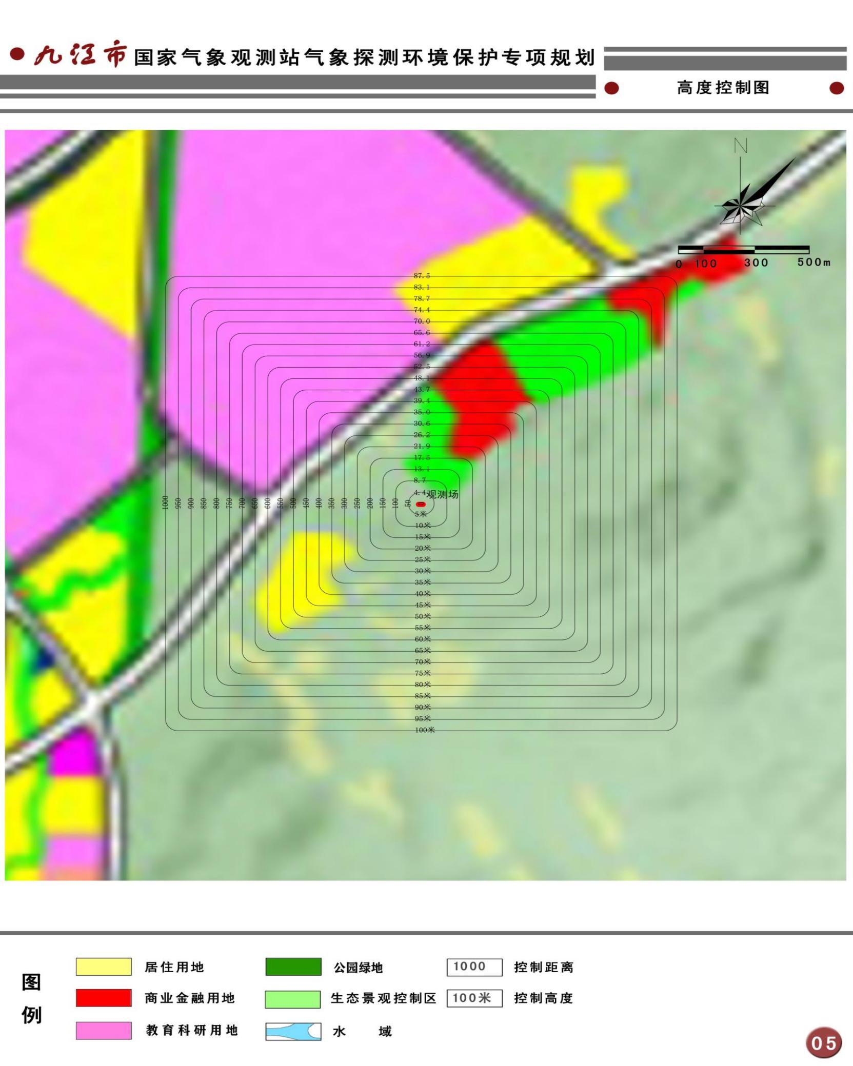 根据气象设施和探测环境保护相关规定,气象探测保护范围确定以九江市国家基本气象观测站气象观测场围栏为基准,所确定的1000米距离控制界线范围。