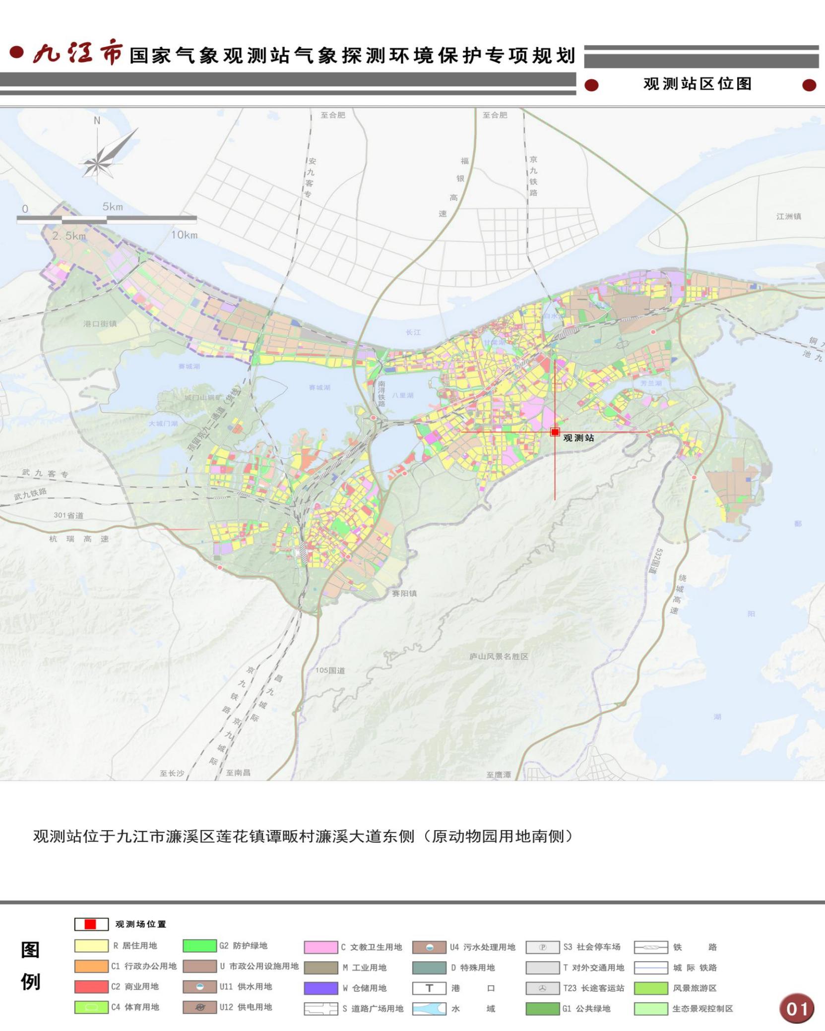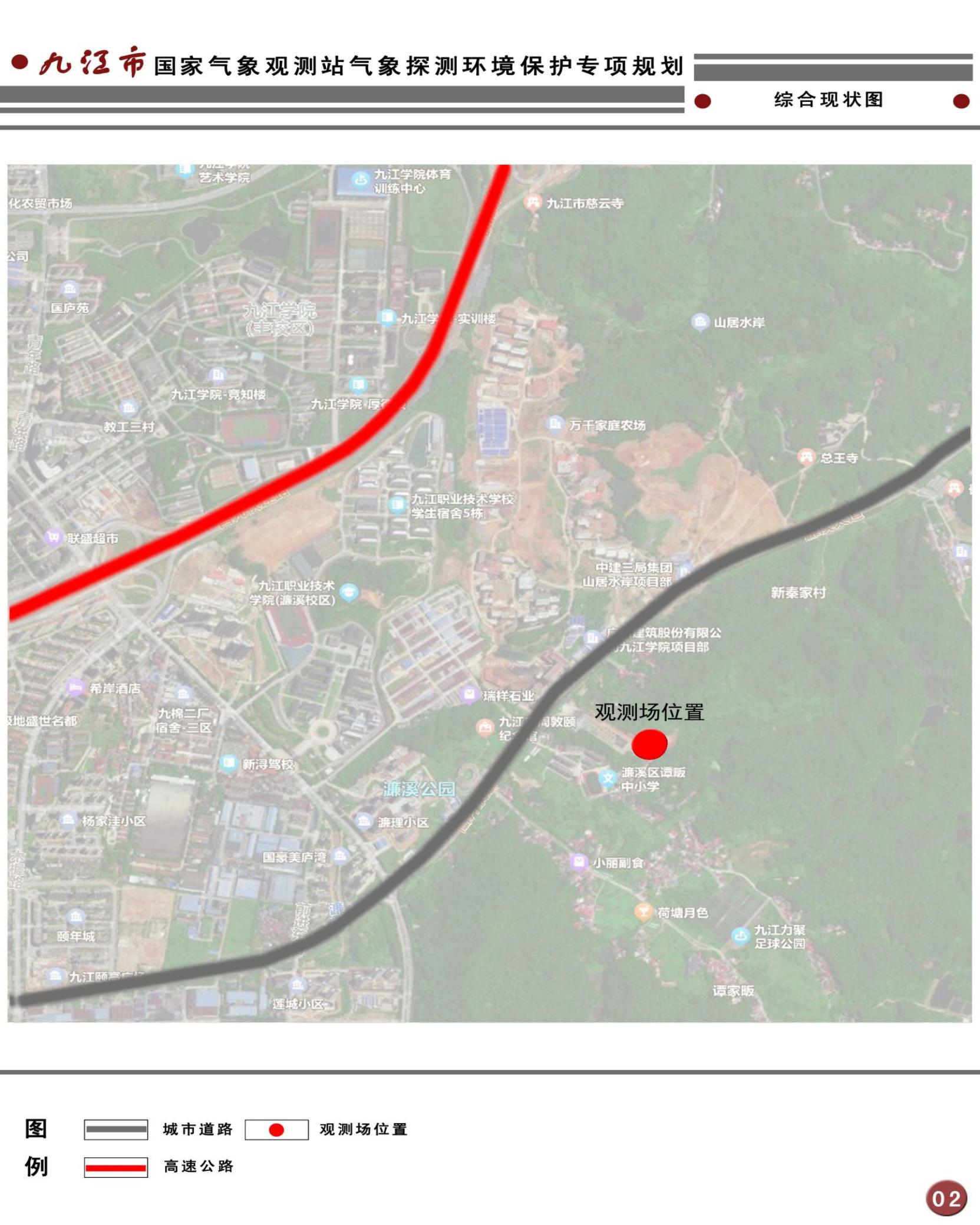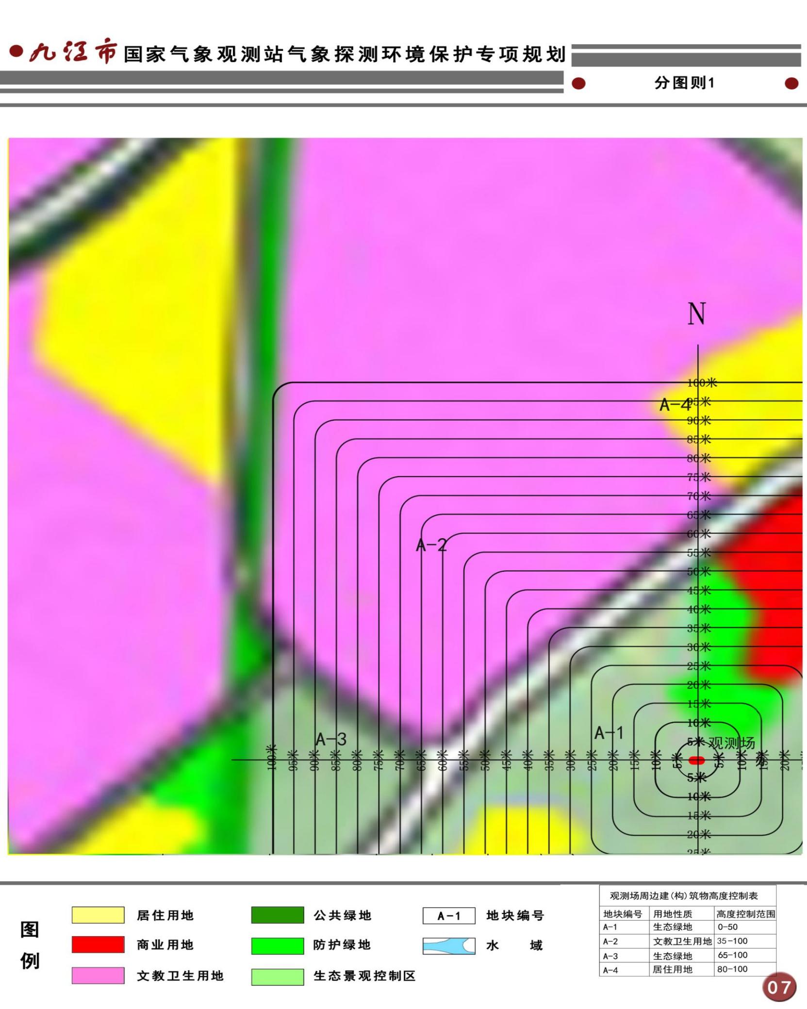 根据气象设施和探测环境保护相关规定,气象探测保护范围确定以九江市国家基本气象观测站气象观测场围栏为基准,所确定的1000米距离控制界线范围。