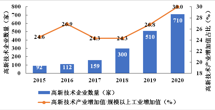 ——高新技术产业加快发展。全市高新技术产业发展取得明显成效,在经济社会发展和产业结构调整中的作用进一步增强。2020年,高新技术产业增加值占规模以上工业增加值的比重上升至30.0%,较上年提高3.2个百分点。高新技术企业数量大幅增长,总数达710家,比2015年(92家)增长6.7倍。全市拥有独角兽(潜在、种子)和瞪羚(潜在)企业27家。