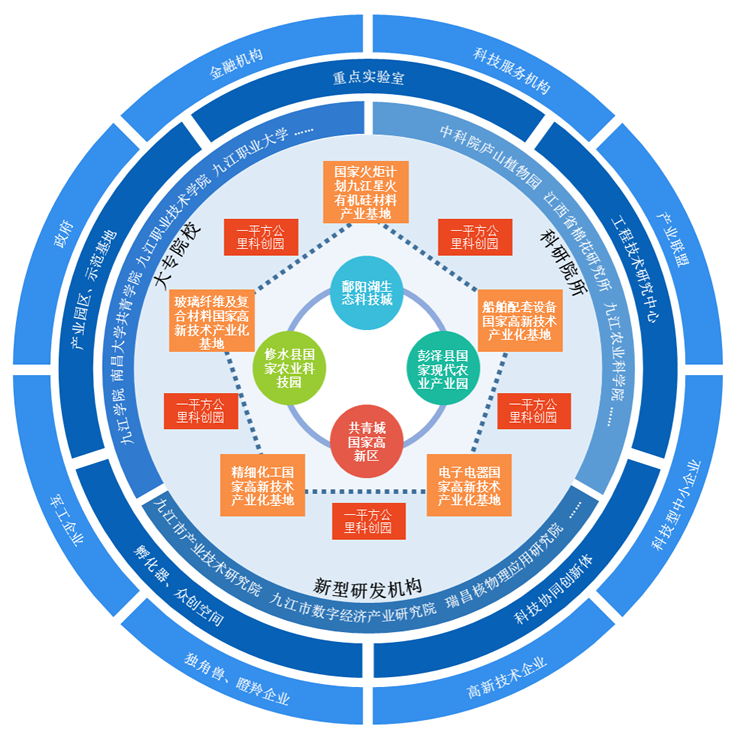 ——区域创新体系不断优化。截至目前,全市拥有各类创新创业平台和载体354家,其中国家级18家,省级118家,市级218家。平台载体建设取得历史性突破,共青国家高新区和修水国家农业科技园先后获批;鄱阳湖生态科技城获批全省重点科创城(数字经济)和省级数字经济创新发展试验基地;有机硅、玻璃纤维及复合材料、船舶配套设备、精细化工、电子电器等5个产业获批国家高新技术产业化基地;各县(市、区)至少一平方公里科创园建设扎实推进,总面积达61.66平方公里,成为全市产业优化升级和县域经济创新发展的高地。全市初步形成“一南一北”“一东一西”“一县一园”“一链一基地”“一企一平台”的区域创新和产业基地建设体系。同时,新型研发机构建设取得长足进步,引进中国科学院、清华大学、厦门大学等知名高校、院所建立了一批新型研发机构,其中4家获批全省首批认定的新型研发机构(共20家),1家获批全省首批高端研发机构(共5家)。