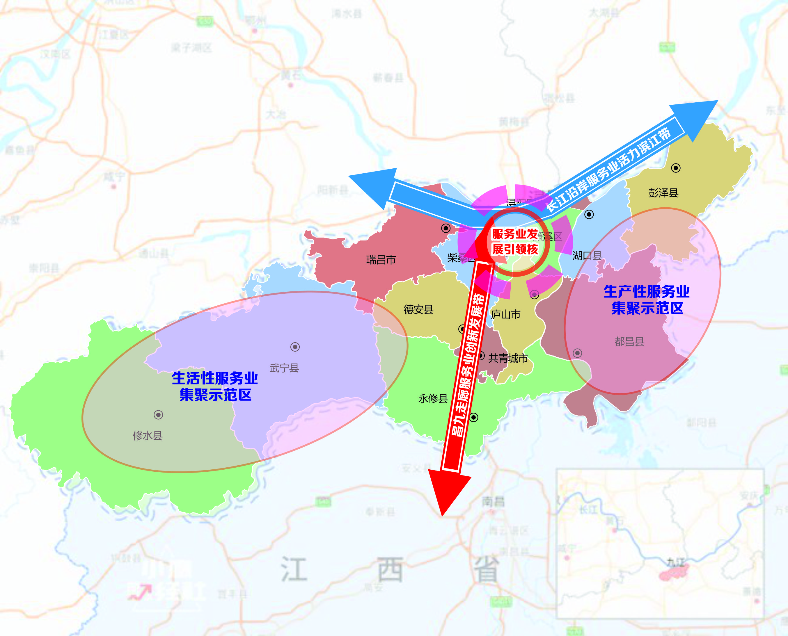 ——两带串联。沿长江串联起瑞昌市、浔阳区、濂溪区、柴桑区等县(市、区),充分发挥临江、临城的优势,重点发展航运物流、电子商务、科技服务、工业设计、节能环保、服务外包等生产性服务业和城区旅游、商贸消费、文化创意、教育培训、居民服务等生活性服务业,培育发展数字经济、平台经济、共享经济、体验经济、夜间经济等服务业新业态新模式,打造长江沿岸服务业活力滨江带。沿昌九高速串联起德安县、共青城市、庐山市、永修县等县(市、区),充分发挥临山、临湖的优势,重点发展现代金融、电子商务、科技服务等生产性服务业和文化旅游、商贸消费、健康养老、体育服务等生活性服务业,培育发展数字经济、夜间经济等服务业新业态新模式,打造昌九走廊服务业创新发展带。