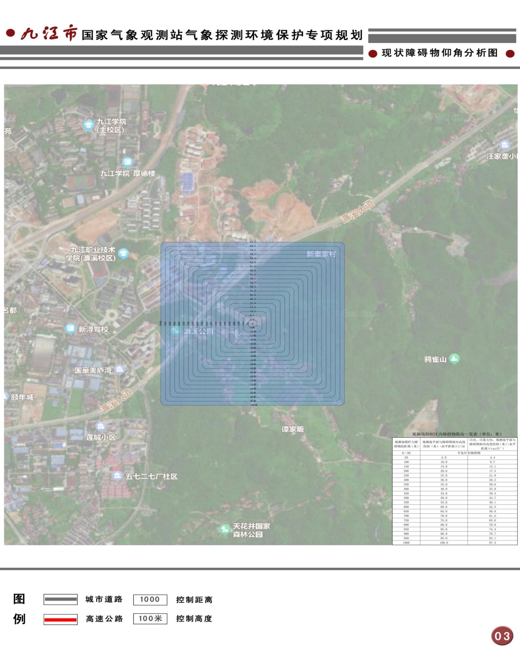 以九江市国家基本气象观测站气象观测场围栏为基准,所确定的1000米距离控制界线范围内控制距离与各仰角建筑物控制高度(详见表2)。