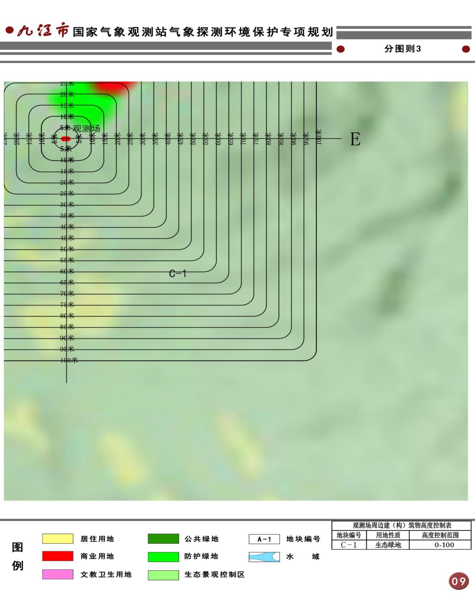 根据气象设施和探测环境保护相关规定,气象探测保护范围确定以九江市国家基本气象观测站气象观测场围栏为基准,所确定的1000米距离控制界线范围。
