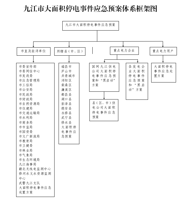 市大面积停电事件应急指挥部由市委宣传部、市委网信中心、市发改委、市应急管理局、市工信局、市公安局、市民政局、市财政局、市自然资源局、市住建局、市交通运输局、市水利局、市商务局、市市监局、市国资委、市文广新旅局、市教育局、市卫健委、市林业局、市气象局、市生态环境局、九江海事局、赣北无线电监测中心、修河水文水资源监测中心、南昌铁路局九江车务段、武警九江支队、国网九江供电公司、国能神华九江发电有限责任公司、国能九江发电有限公司、中石化九江石油分公司等部门和单位组成。