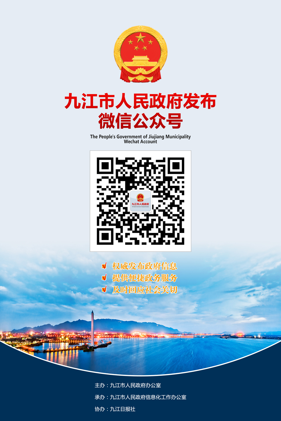 为深入推进“五型”政府建设,充分发挥政务新媒体在推进政务公开、凝聚社会共识、创新社会治理等领域重要作用,2019年12月20日,“九江市人民政府发布”微信公众号正式上线。公众只需搜索微信公众号“九江市人民政府发布”并点击关注,即可第一时间了解九江重大政策、重要活动、重点信息。
