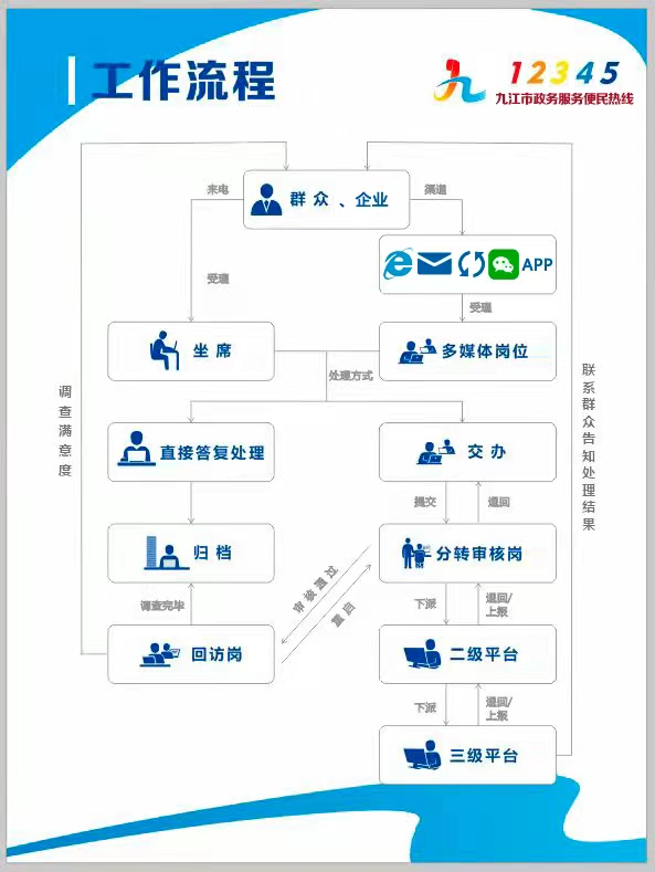九江市12345政务服务便民热线是九江市人民政府设立,整合全市各类非紧急、非警务类政务服务资源的基础上,依托一个号码提供“7×24小时”全天候热线服务,全力打造便捷、高效、规范、智慧的政务服务“总客服”,恪守“听民声、解民意、集民智、强监督”的工作要求,秉持“12345有事找政府”的服务理念,确保企业和群众反映的问题和合理诉求及时得到处置和办理,提高城市治理法治化、精准化、智能化、专业化水平。
