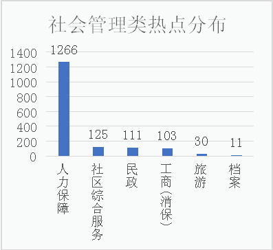 2.社会管理类诉求共1655件,其中人力保障诉求最多,1266件,占比76.49%;社会综合服务125件,占比7.6%;民政111件,占比6.7%;工商(消保)103件,占比6.2%;旅游30件,占比1.8%,档案11件,占比0.7%。