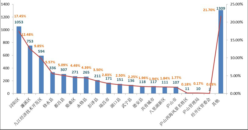 从市民诉求地域分布的总体来看,前6的地区有浔阳区、濂溪区、九江经济技术开发区、修水县、都昌县、柴桑区,总计占比为54.96%。剩余所有地区总占比为45.07%