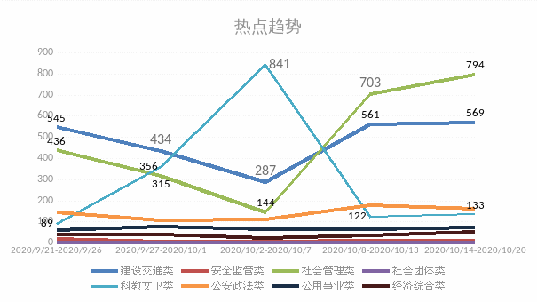 市民诉求热点主要集中在社会管理、建设交通、科教文卫和公安政法四个大类,分布趋势图如下: