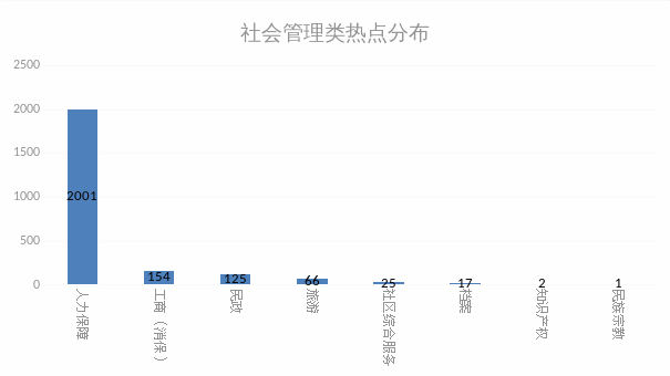 1.社会管理类诉求共2391件,其中人力保障诉求居多,2001件,占比83.69%;工商(消保)154件,占比6.44%;民政125件,占比5.23%;旅游66件,占比2.76%;社区综合服务25件,占比1.05%;档案17件,占比0.71%;知识产权2件,占比0.08%;民族宗教1件,占比0.04%。