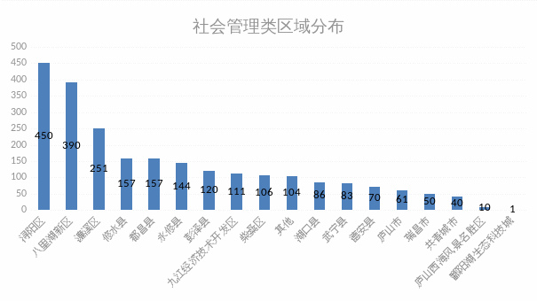 从诉求分布来看,浔阳区、八里湖新区、濂溪区3个区的社会管理类诉求量较大,主要集中在人力保障、工商(消保)、民政、旅游等方面。庐山西海风景名胜区和鄱阳湖生态科技城诉求量整体较少。
