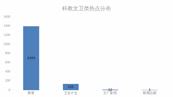3.科教文卫类诉求共1541件,其中教育诉求最多,1393件,占比90.4%;卫生计生135件,占比8.76%;文广影视12件,占比0.78%;新闻出版1件,占比0.06%。