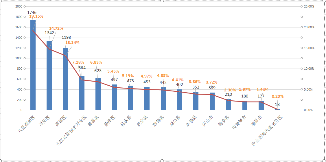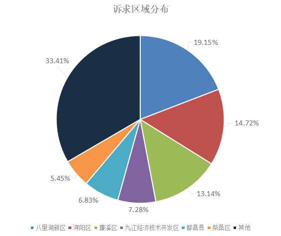 从市民诉求地域分布的总体来看,前六的地区有八里湖新区、浔阳区、濂溪区、九江经济技术开发区、修水县及柴桑区,总计占比为66.59%,剩余所有地区总占比为33.41%。