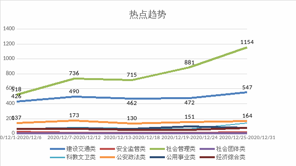 市民诉求热点主要集中在社会管理、建设交通及公安政法三大类,分布趋势图如下: