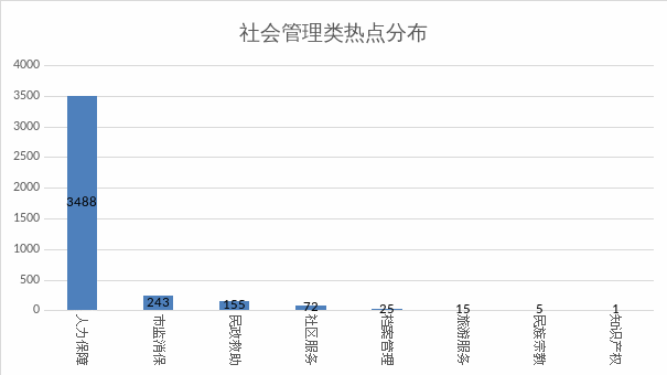 1.社会管理类诉求共4004件,其中人力保障诉求居多,共3488件,占比87.11%;市监消保243件,占比6.08%;民政救助115件,占比3.87%;社区服务72件,占比1.80%;档案管理25件,占比0.63%;旅游服务15件,占比0.37%;民族宗教5件,占比0.12%;知识产权1件,占比0.02%。
