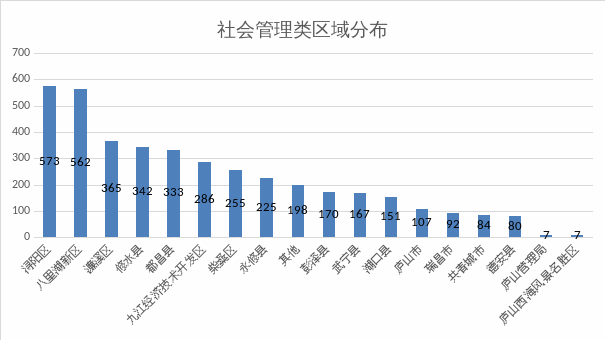 从诉求区域分布来看,社会管理类诉求浔阳区、八里湖新区、濂溪区及修水县4个地区的诉求量较大。庐山管理局和庐山西海风景名胜区诉求量整体较少。