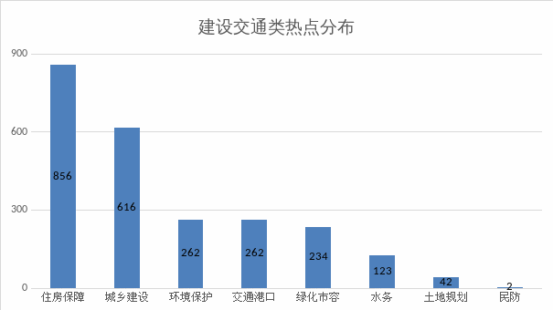 2.建设交通类诉求共2397件,其中住房保障诉求居多,共856件,占比35.71%;城乡建设616件,占比25.71%;环境保护262件,占比10.93%;交通港口262件,占比10.93%;市容绿化234件,占比9.76%;水务供水123件,占比5.13%;土地规划42件,占比1.75%;人防设施2件,占比0.08%。