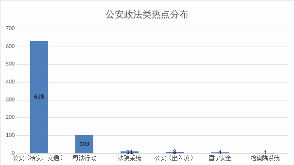 3.公安政法类诉求共755件,其中治安交管诉求居多,共628件,占比83.18%;司法行政103件,占比13.62%;法院系统11件,占比1.46%;公安出入境8件,占比1.07%;国家安全4件,占比0.54%;检察系统1件,占比0.13%。