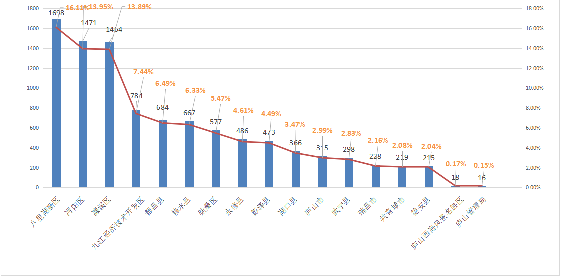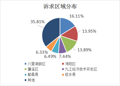 从市民诉求地域分布的总体来看,八里湖新区、浔阳区、濂溪区、九江经济技术开发区、都昌县及修水县诉求较多,合计总占比64.19%,剩余所有地区总占比为35.81%。
