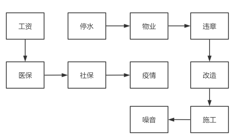 经济纠纷类,包括工资、停水、物业、违章四个热点。