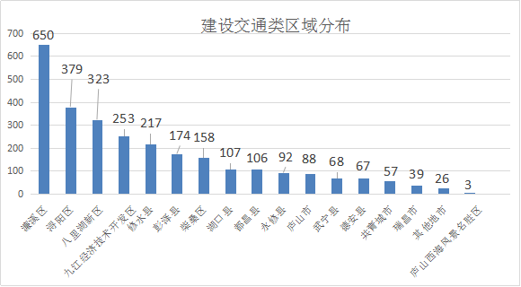 从诉求区域分布来看,建设交通类诉求在濂溪区、浔阳区及八里湖新区的分布量较大。庐山西海风景名胜区诉求量整体较少。