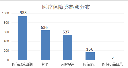 2.医疗保障类诉求共2275件,其中医保政策咨询居多,共933件,占比41.01%;其他636件,占比27.96%;医保报销537件,占比23.60%;医保定点166件,占比7.30%;医保药品目录3件,占比0.13%。