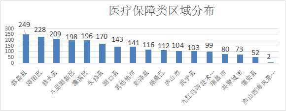 从诉求区域分布来看,医疗保障类诉求在都昌县、浔阳区及修水县的分布量较大。庐山西海风景名胜区诉求量整体较少。