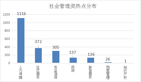 3.社会管理类诉求共2093件,其中人力保障居多,共1116件,占比53.32%,社区服务372件,占比17.77%;市监消保305件,占比14.57%;民政137件,占比6.55%;旅游服务136件,占比6.50%;档案管理26件,占比1.24%;知识产权1件,占比0.05%。