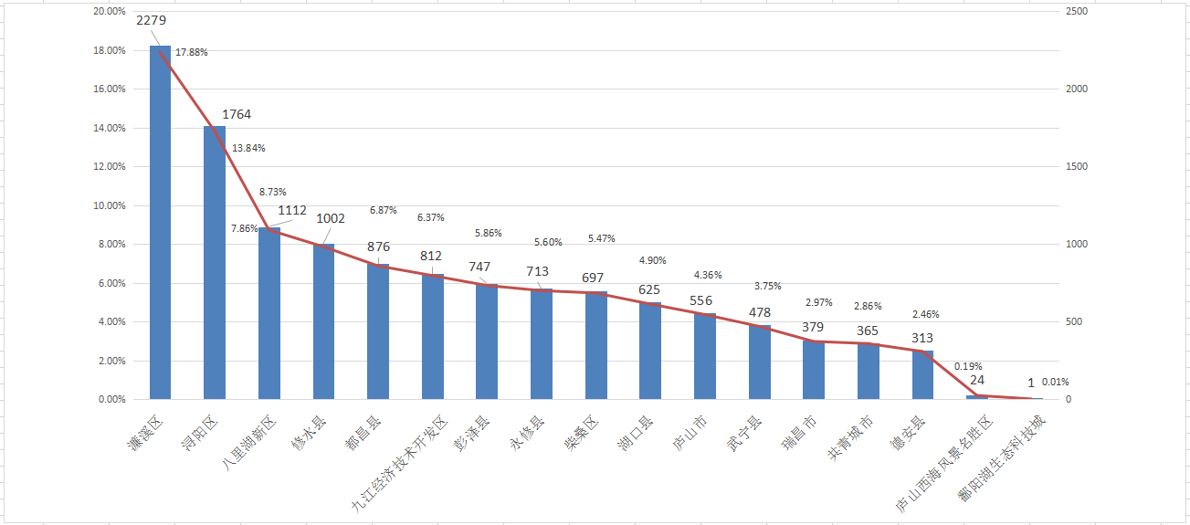 从市民诉求行政区域分布总体来看,7月份九江地区诉求工单共12743件,排名前六位的地区分别为濂溪区、浔阳区、八里湖新区、修水县、都昌县及九江经济技术开发区,合计总占比61.56%。(说明:不包含市直单位数据)