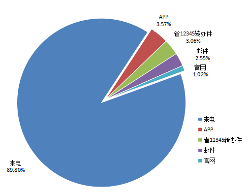 交办工单2972件(其中通过“热线来电”渠道受理工单2494件、“APP”渠道受理工单183件、“邮箱”渠道受理工单92件、“省转办件”渠道受理工单195件、“政府网线上客服”渠道受理工单5件、“热线短信”渠道受理工单3件),占比15.25%。