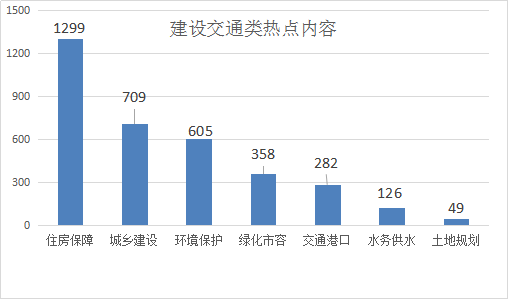 1.建设交通类诉求共3428件,其中住房保障诉求居多,共1299件,占比37.89%;城乡建设709件,占比20.68%;环境保护605件,占比17.65%;绿化市容358件,占比10.44%;交通港口282件,占比8.23%;水务供水126件,占比3.68%;土地规划49件,占比1.43%。