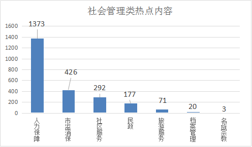 2.社会管理类诉求共2362件,其中人力保障居多,共1373件,占比58.13%;市监消保426件,占比18.04%;社区服务292件,占比12.36%;民政177件,占比7.49%;旅游服务71件,占比3.01%;档案管理20件,占比0.85%;民族宗教3件,占比0.13%。