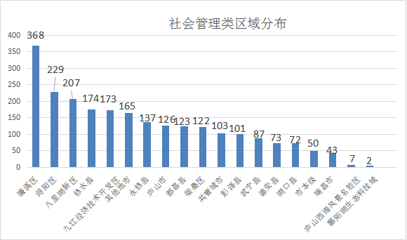 从诉求区域分布来看,社会管理类诉求在濂溪区、浔阳区及八里湖新区的分布量较大。庐山西海风景名胜区和鄱阳湖生态科技城诉求量整体较少。