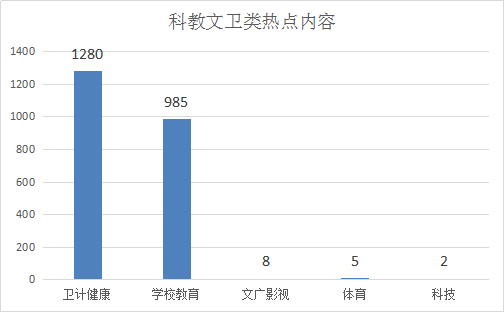 3.科教文卫类诉求共2280件,其中卫计健康居多,共1280件,占比56.14%;学校教育985件,占比43.20%;文广影视8件,占比0.35%;体育5件,占比0.22%;科技2件,占比0.09%。