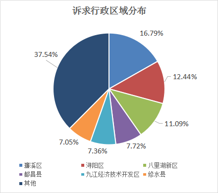 从市民诉求行政区域分布总体来看,9月份九江地区诉求工单共15499件,排名前六位的地区分别为濂溪区、浔阳区、八里湖新区、都昌县、九江经济技术开发区及修水县,合计总占比62.46%。(说明:不包含市直单位数据)