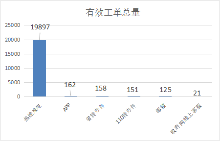 12345热线共登记有效工单20514件(其中通过“热线来电”渠道受理工单19897件、“APP”渠道受理工单162件、“省转办件”渠道受理工单158件、“110转办件”渠道受理工单151件、“邮箱”渠道受理工单125件、“政府网线上客服”渠道受理工单21件)。