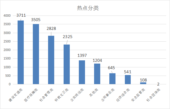 建议类105件,占比0.51%,主要涉及治安交管、城乡建设、住房保障、绿化市容、卫计健康等问题;